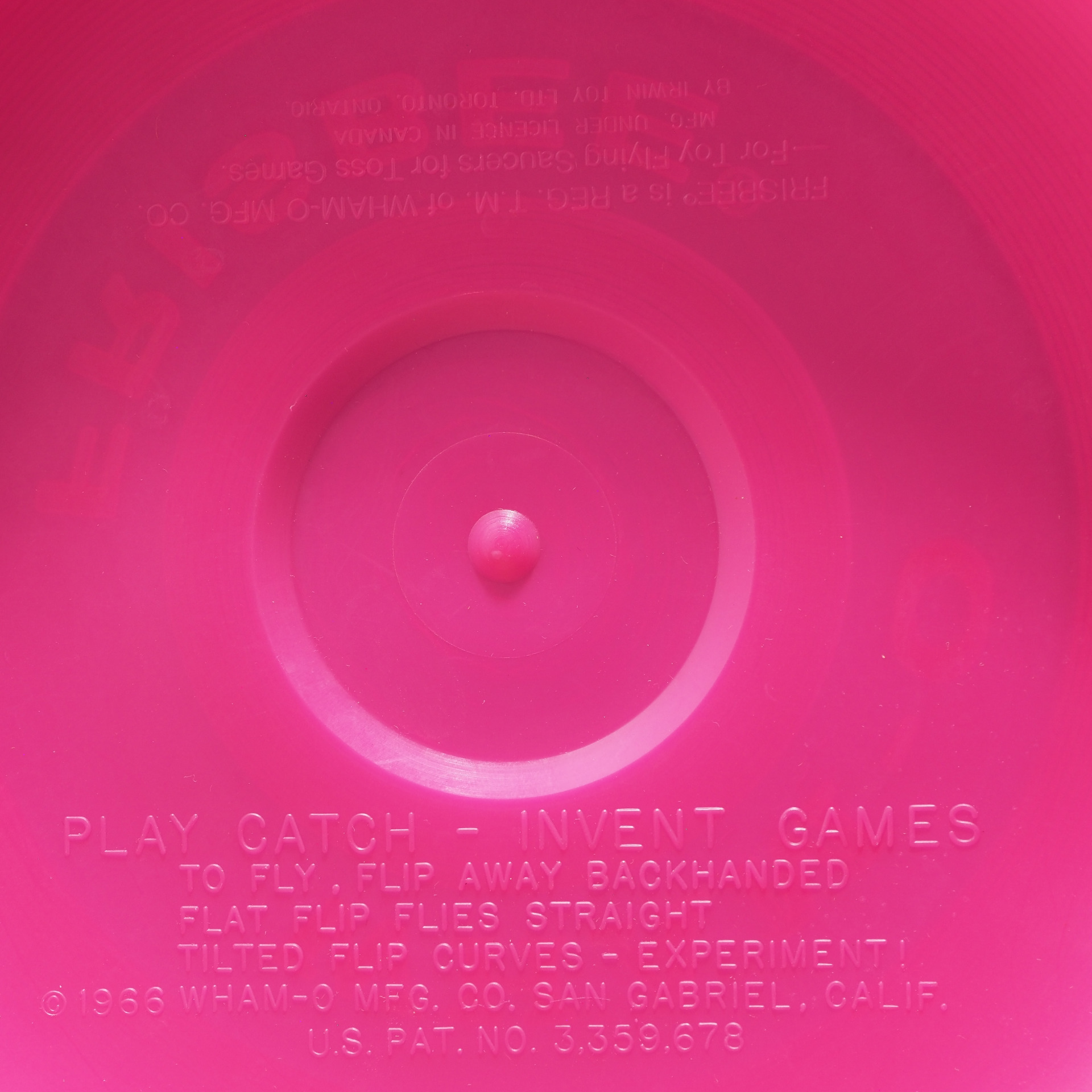 Changes in the bottom script: The text Pat. Pend. was removed and changed to DES. PAT. 183626. The change was made because The word "Frisbee" was registered as a Wham-O trademark. Lines 2-4 are left justified in the same way as in No Mold. Molds 3-5 have no left justification except for the first version of mold 3, LBFS1. Unlike on the front, the font appearance was changed on the bottom. The font used is clearly wider than on the No Mold. In fact, the exact same font has been used on the bottom of the 2 mold as on the 4 mold. The 2 mold has been bolded while the 4 mold has not been bolded.