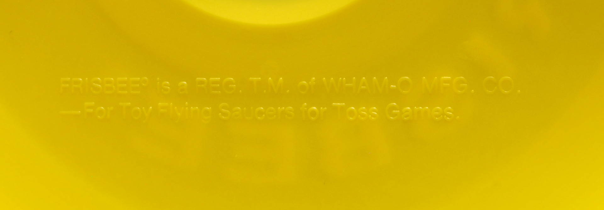 Toss Games Script was added to the bottom of disc. The script says "Frisbee® is a REG. T.M. of WHAM-O MFG. CO., —For Toy Flying Saucers For Toss Games".