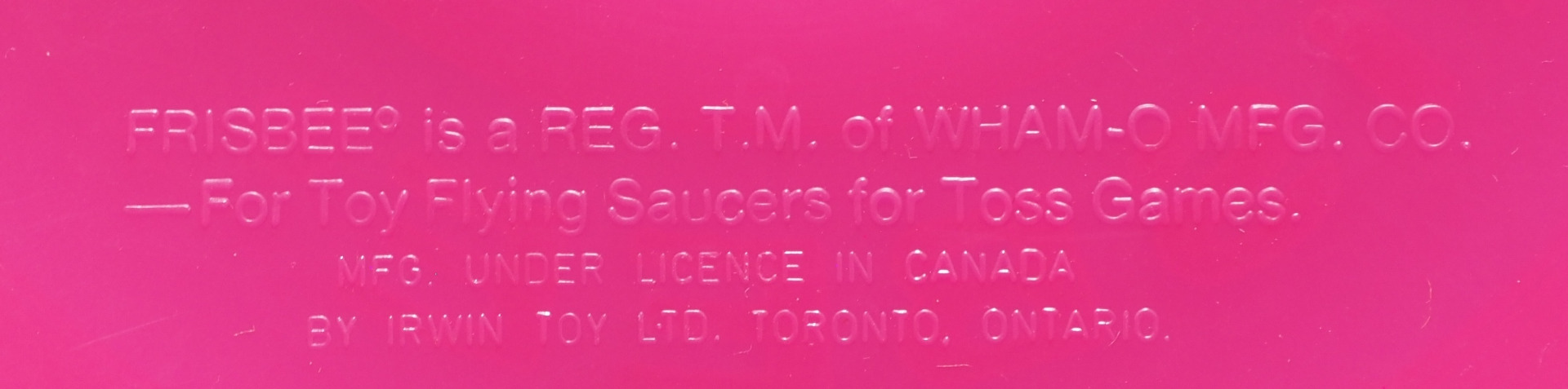Irwin Toy's finally branded their discs. In this version the tooling is just below the toss games script and it reads: "Mfg Under Licence in Canada; By Irwin Toy LTD. Toronto, Ontario."