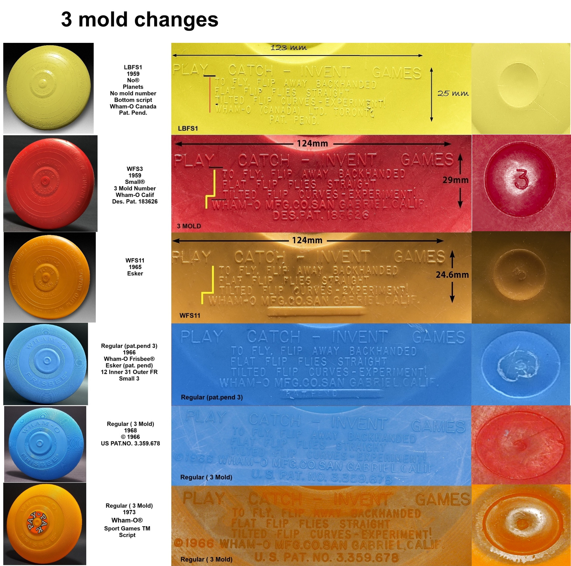 The LBFS1 mold has been modified 6 times since its production. 3 different versions of Flying Saucers have been made: LBFS1, WFS3 and WFS11. In 1966, Wham-O transformed Flying Saucers into Regular Frisbees. There have been 3 different versions of Regulars made with Mold 3. Regular Pat Pend. Mold 3, Regular Mold 3 (1968) and Regular Mold 3 (1970). In addition to that, Regular Pat Pend. Mold 3 has been made another version where the mold flaws have been fixed.
