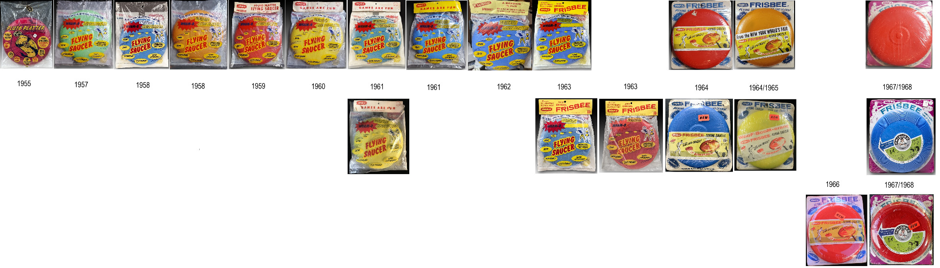 Identical to the Type-E WPP packaging which has the word "Frisbee" in blue outlined type with ® to the right (first time)—angled above a solid, blank, parallel yellow bar with no "Pluto Platter" name on it. Probably in 1963. -Phil Kennedy