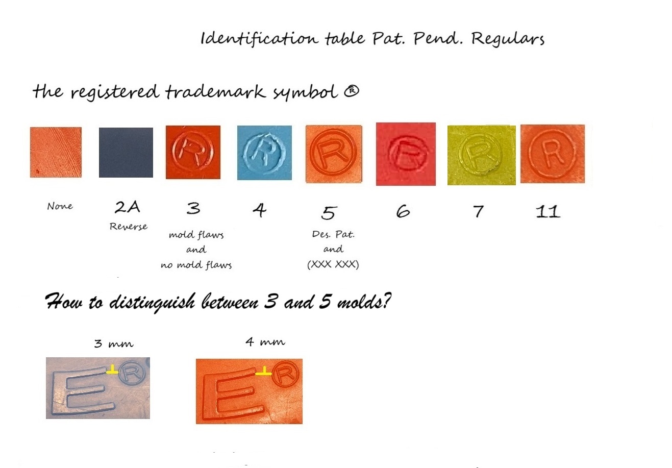 The picture shows a table that can be used to identify pat. pend Regulars from each other using only the ® symbol.