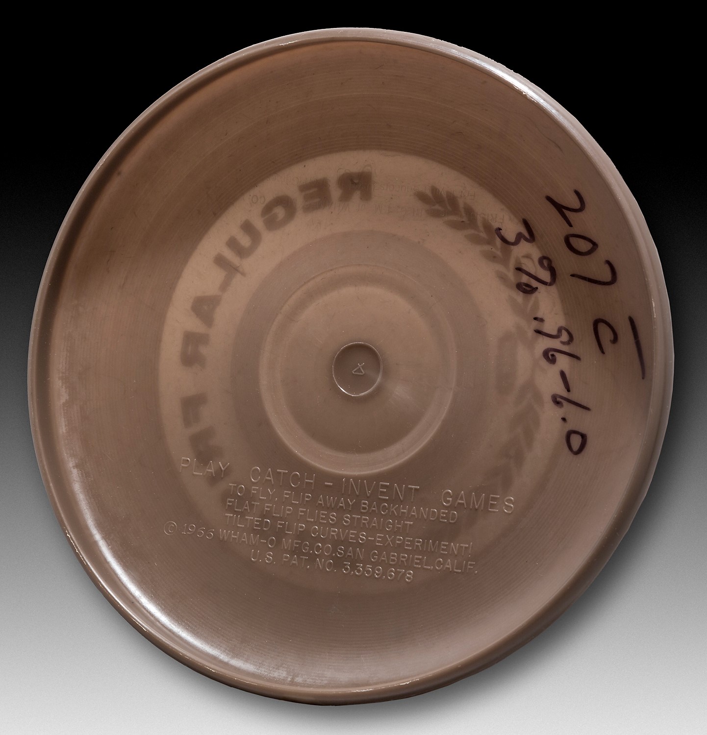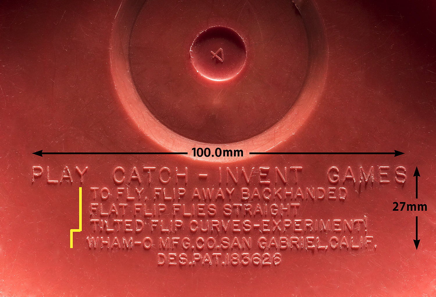 The next change was in 1968, because Wham-O received the patent on December 26, 1967. The symbol © and the year 1966 were added at the beginning of line 5. 1966 is the year when production of Regular products began. The addition of the year and the © symbol was done carelessly. The symbol © is too low on the line and the C is not in the middle of the circle. The number 9 is too high and the spacing between the numbers is not even. In line 6, the text pat pend were removed and it was changed to: U.S. PAT. NO. 3,359,678.