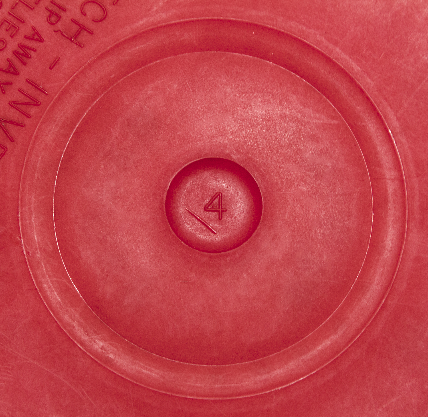 4 Mold characteristics are: On the front 4 molds have 24 portholes like other Flying Saucers, but they are oval. But why are the portholes oval, when in all other molds they are round? The word Frisbee is followed by a medium-sized ® symbol. Line 5 of the bottom script starts slightly to the left of lines 2–4. A large exclamation mark at the end of line 4. In line 5 MFG.CO.SAN is written together in the same way as in mold 3. There is a large mold number 4 on the bottom.